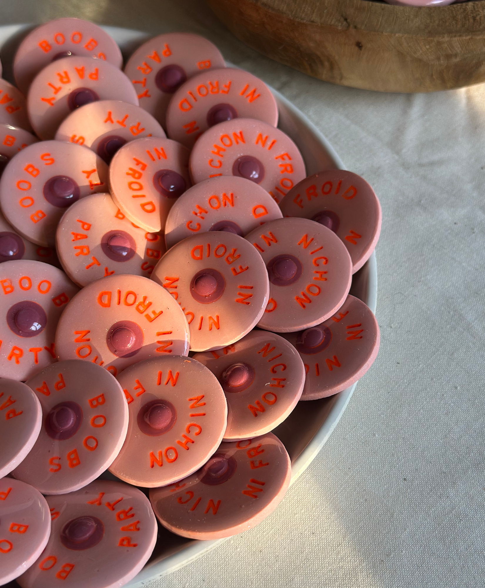 Cette création comme une petite attention douce et pétillante, à s’offrir ou à offrir, pour soutenir la lutte contre le cancer du sein. Pour chaque magnet acheté, 2€ reversés à l’association « Tatoue ton téton » pour participer au financement d’une reconstruction d’auréole mammaire par le tatouage.